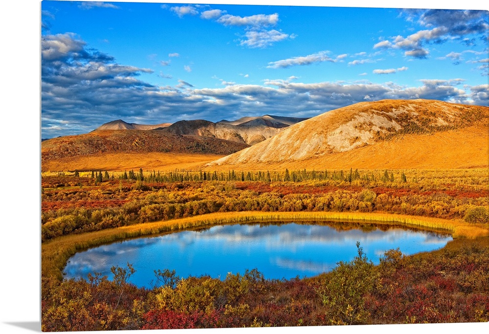 <p>The Setting Sun Illuminates The Vibrant Colours Of The Tundra And A Pond Along The Dempster Highway; Yukon Canada</p>