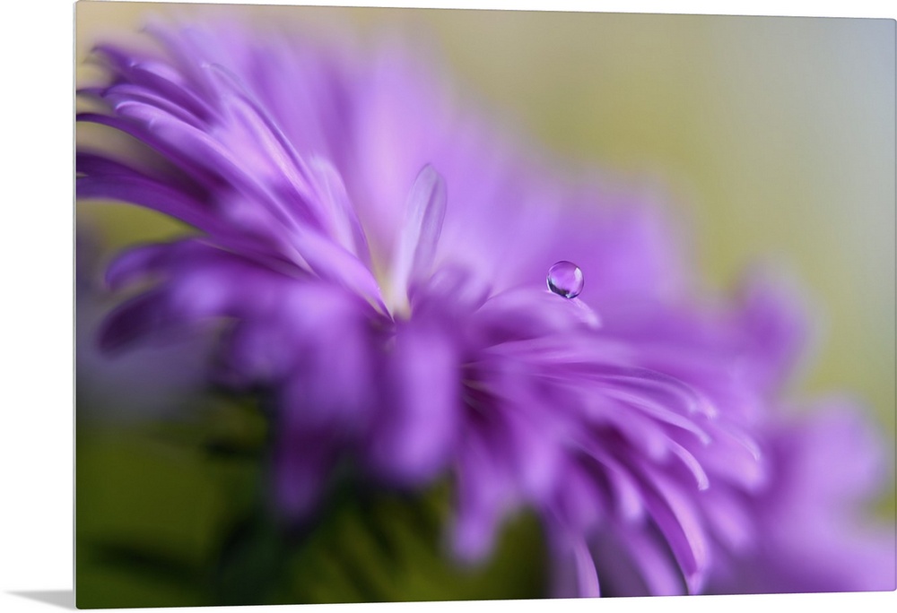 <p>Close up view of a round dew drop perched on the edge of a purple flower petal.</p>