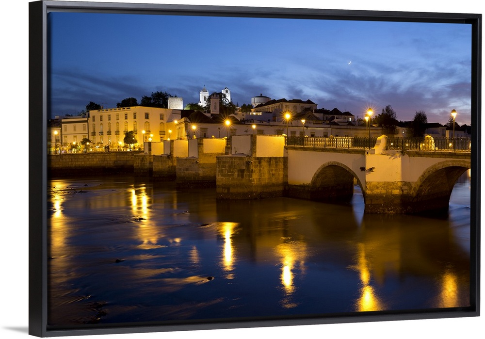 <p>Seven arched Roman bridge and town on the Rio Gilao river at night, Tavira, Algarve, Portugal</p>