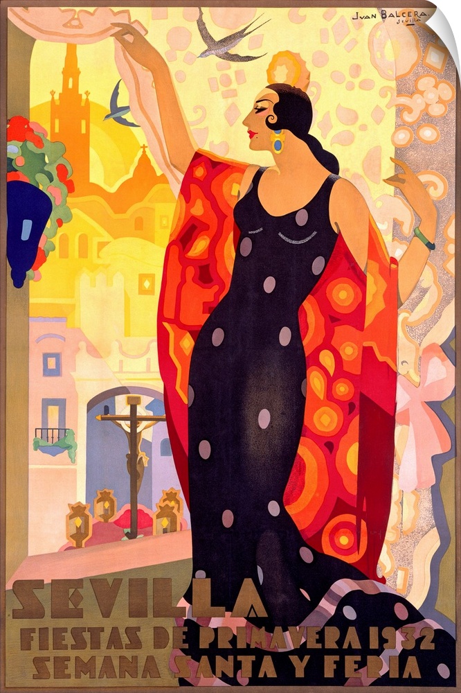 <p>Vintage poster of a tall Spanish woman wearing a polka dot gown as she lifts a curtain to look out toward the town in Seville.</p>