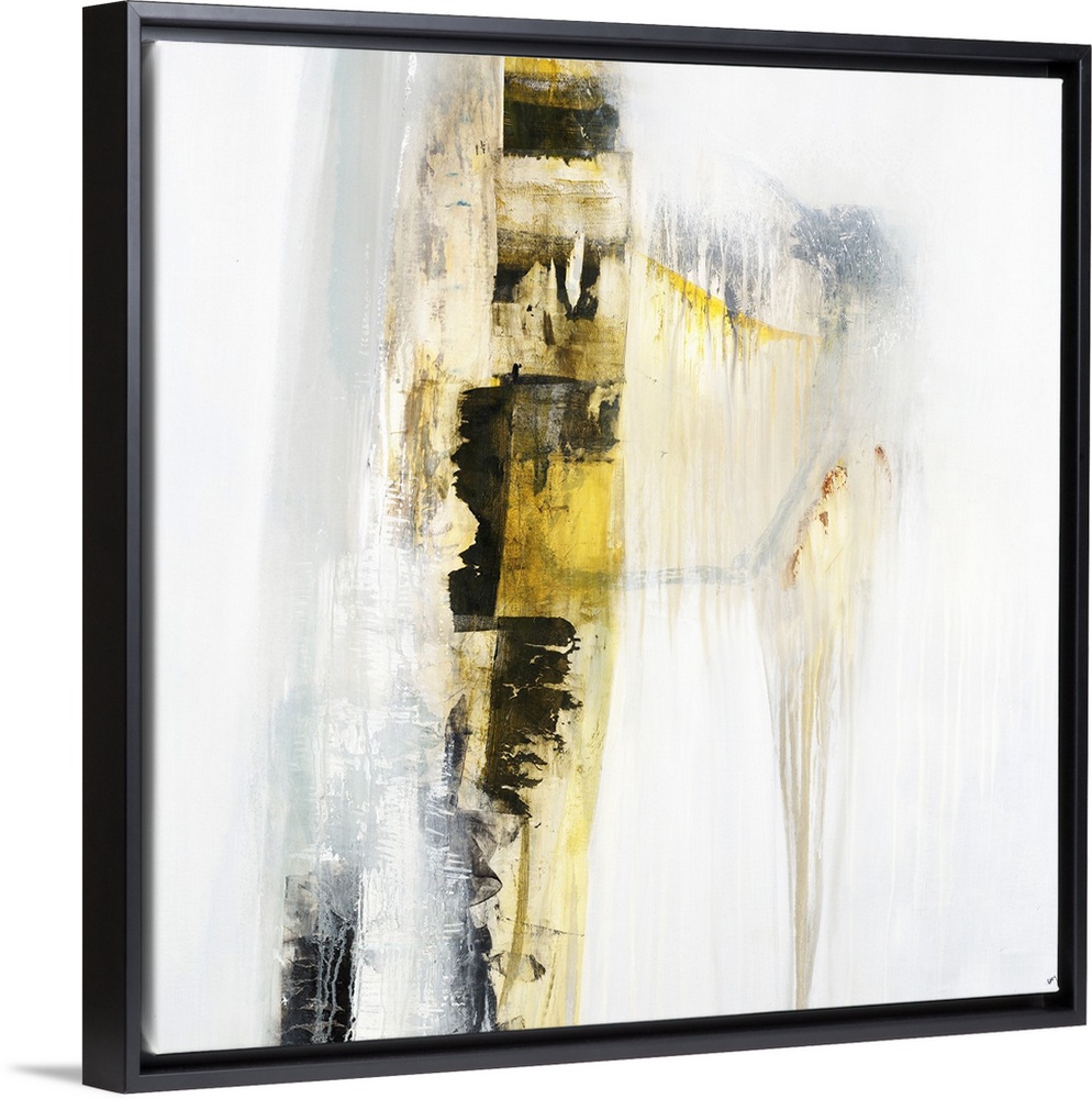 <p>Square abstract painting with a yellow and black vertical line going down the canvas with a faint circle in the background and gray and yellow paint dripping to the bottom.</p>