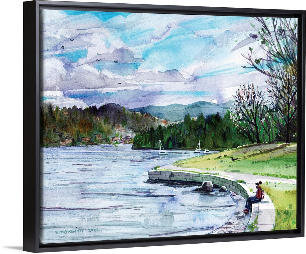<p>A lady takes a rest next to the waters of Lake Washington on an early spring day. In the distance, you can see Seward Park, boats anchored in Andrews Bay, and houses in the trees on the distant Mercer Island. The scene was captured in plein air (on location) in watercolor and markers.</p>