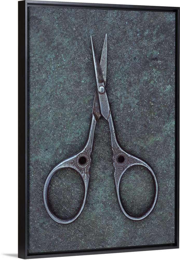 <p>Antique steel sewing scissors decorated with small pattern lying on tarnished metal</p>