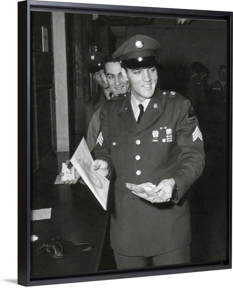 <p>Sgt. Elvis A. Presley, 32nd Armored, 3rd Armored Div. collecting his last pay as he re-enters civilian life. March 5, 1960.</p>
