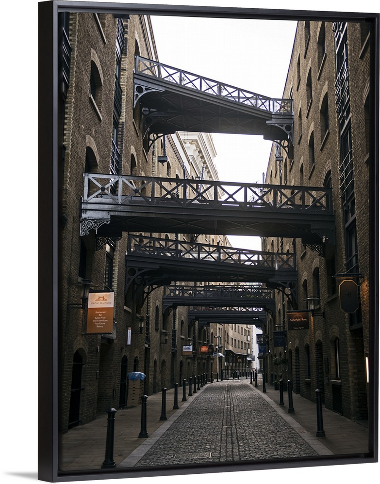 <p>Photograph of Shad Thames lined with warehouses and walkways alongside Tower Bridge in London.</p>