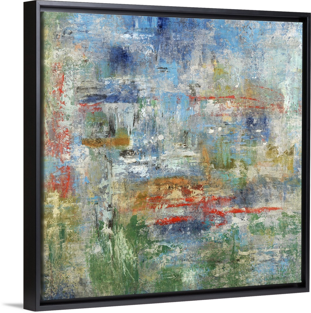 <p>Square abstract painting in blue, green, red, gold, and gray hues.</p>