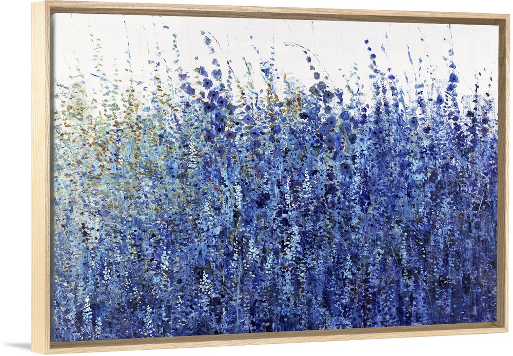 <p>A thick mass of tall wildflowers and grasses in shades of blue and indigo against a white background. Painted in a casual, impressionist style, this horizontal image would perfectly suit a bedroom or living room in a transitional or contemporary style.</p>