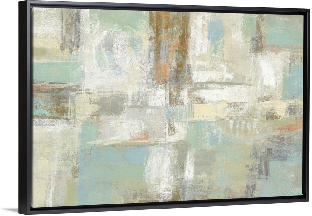 <p>Abstract artwork featuring rectangular shapes in cool colors with a distressed textures.</p>
