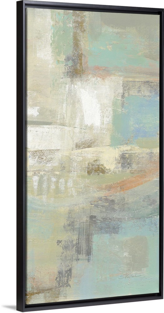 <p>Vertical abstract painting of brush strokes in textured tones of blue, green and white.</p>