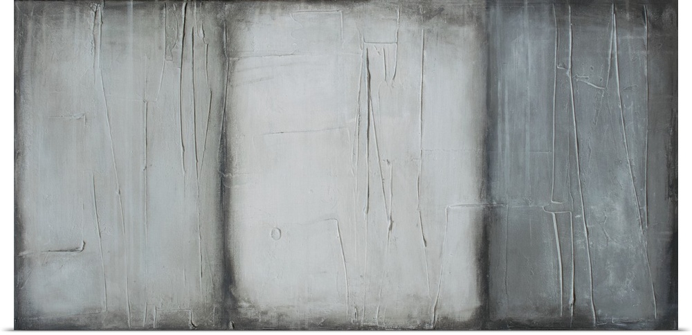 <p>Wide abstract painting made into three sections with different shades of gray and thin lines on top creating texture and depth.</p>
