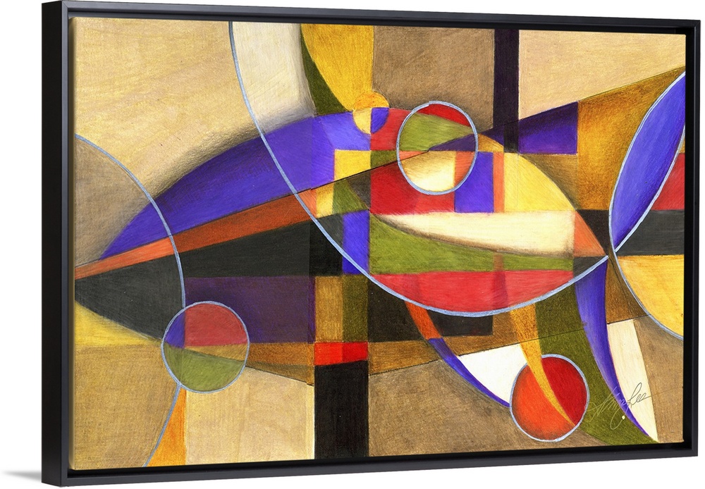 <p>Horizontal abstract painting of vibrant colored shapes in circles and triangles.</p>