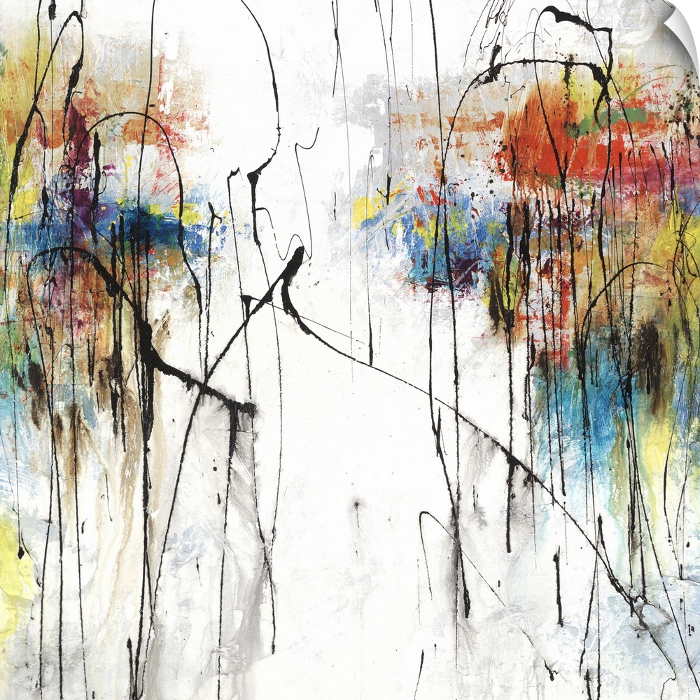 <p>Square abstract art with clusters of color on the two sides on a white and gray background with thin black squiggly lines on top.</p>