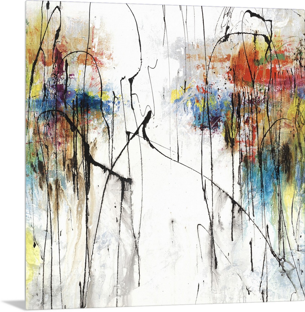 <p>Square abstract art with clusters of color on the two sides on a white and gray background with thin black squiggly lines on top.</p>