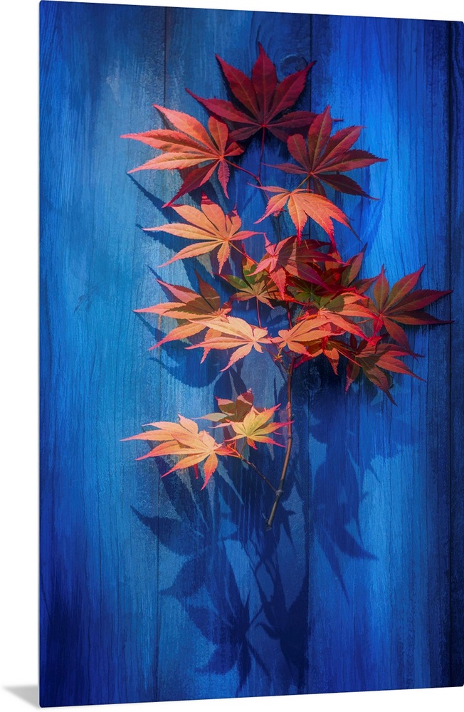 <p>Photograph of green and red Japanese maple leaves casting shadows on a bright blue piece of wood.</p>