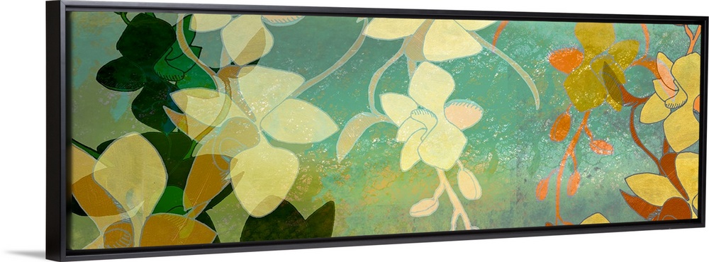 <p>Big contemporary art shows different groups of flowers as they are layered on top of each other and create depth. Artist uses solid colors and minimal detail on the flowers.</p>