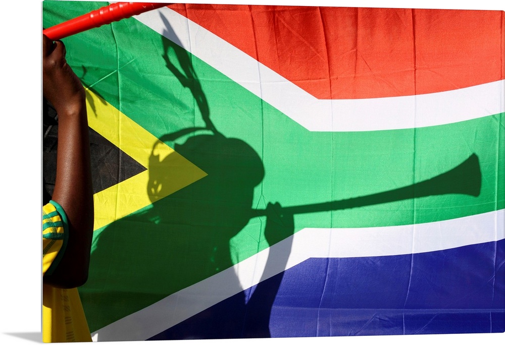 <p>Shadow of soccer supporter blowing vuvuzela, South African flag in background, Johannesburg, South Africa</p>