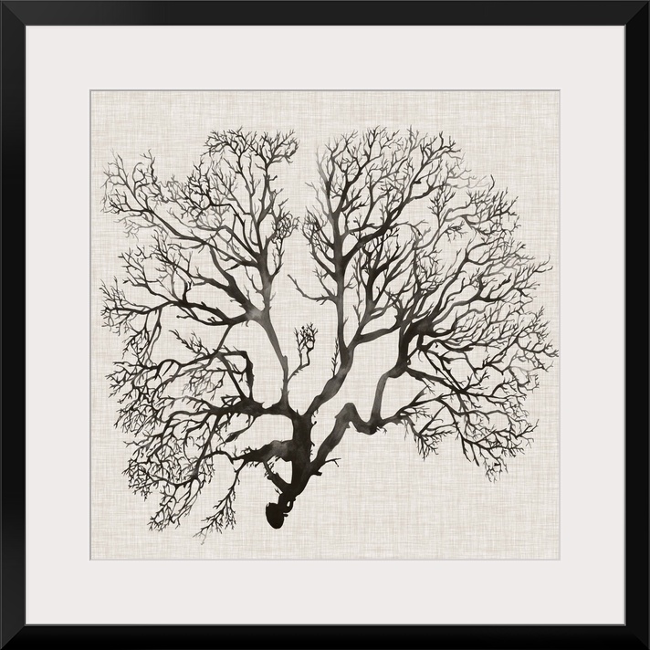 <p>Contemporary decor artwork of a coral sea fan in black against a textured background.</p>