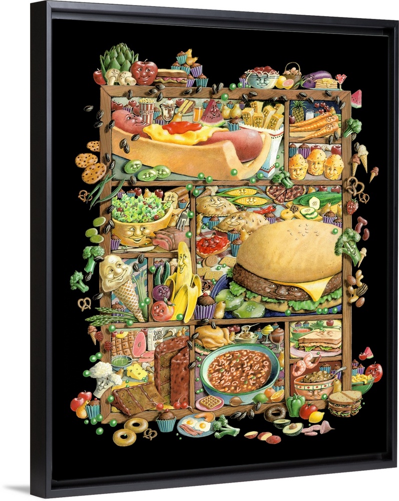 <p>Illustrated shadowbox of different types of food on a black background.</p>