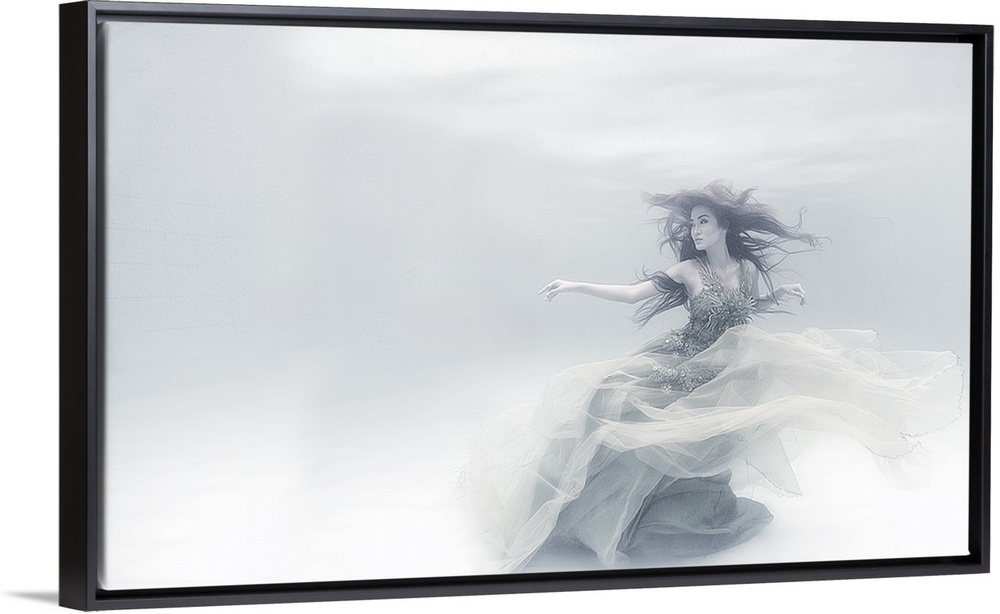 <p>Underwater portrait of a woman in a flowing dress, in soft white light.</p>