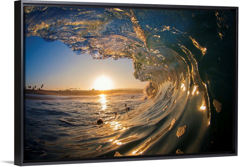 <p>Large ocean wave arcing over the setting sun on the horizon.</p>