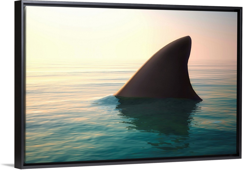 <p>Shark fin above the ocean water at sunset.</p>