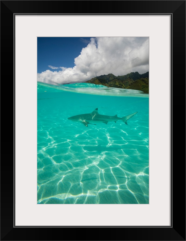 <p>Over Under, half water half land, Shark in the Pacific Ocean, Moorea, Tahiti, French Polynesia</p>