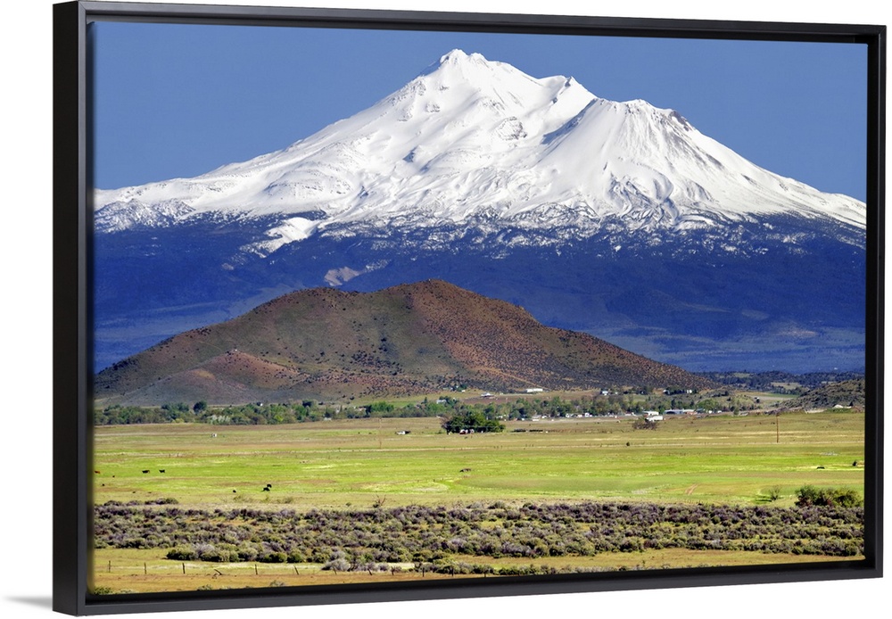 <p>Landscape photograph of rural fields with a snow covered Mount Shasta in the background.</p>