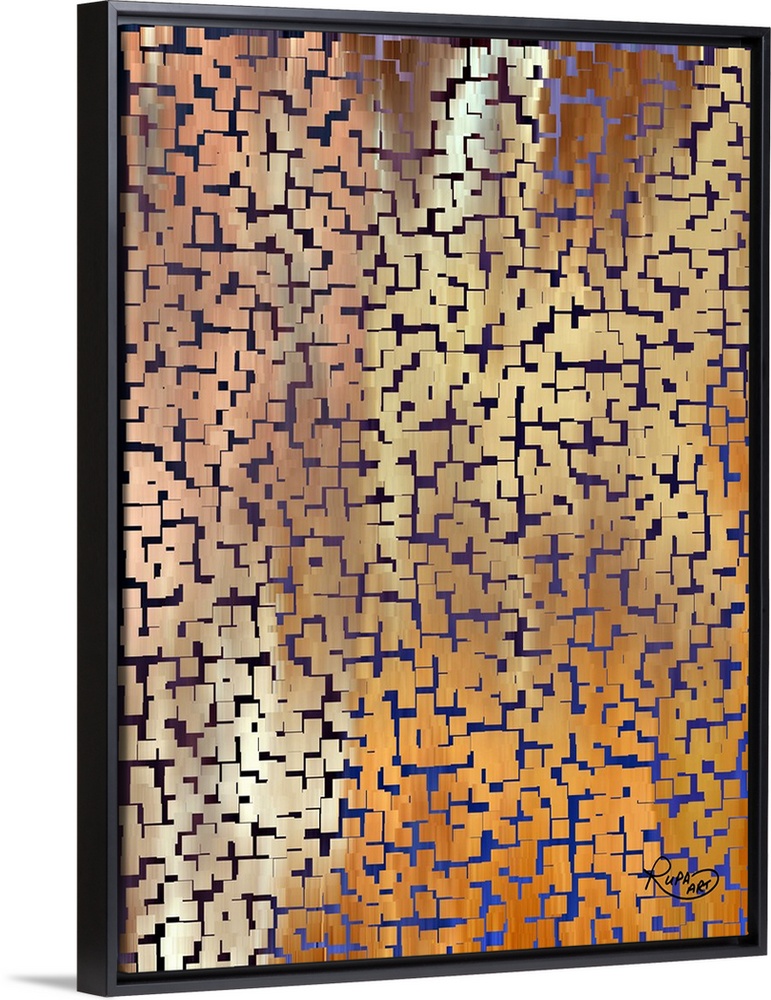 <p>Square abstract piece with tiny solid gold squares layered on each other to create a cracked look on a blue and purple background.</p>