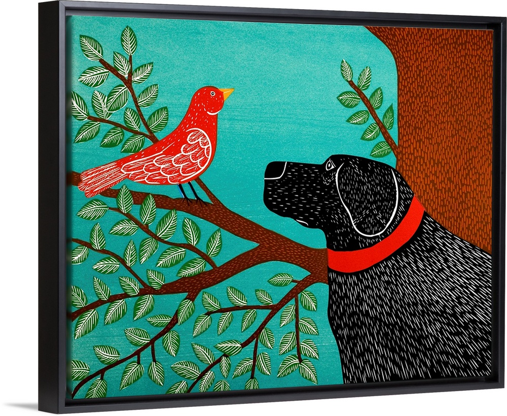 <p>Illustration of a black lab starring at a red bird perched on a tree branch.</p>