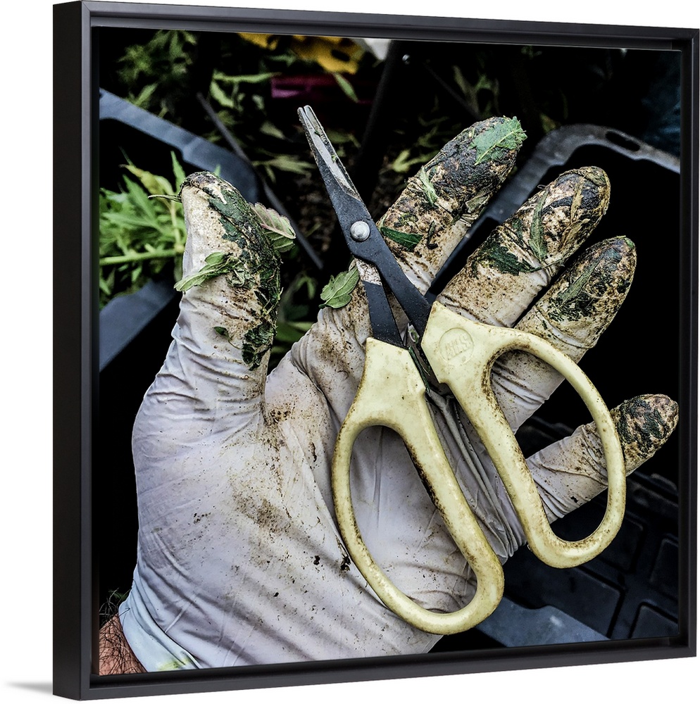 <p>Close up shot of a pair of shears in the hands of a member of production staff, Cannabis cultivation facility, Colorado</p>