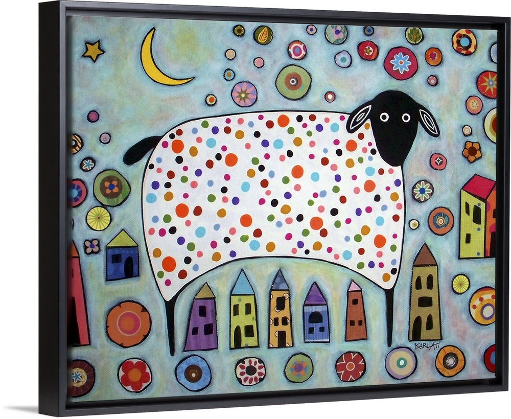 <p>Contemporary painting of a woolly sheep with small buildings and a crescent moon.</p>