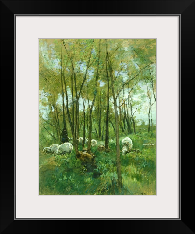 <p>Sheep in a Forest, by Anton Mauve, 1848-88, Dutch watercolor painting. Shepherd with floc of sheep grazing in a woods.</p>