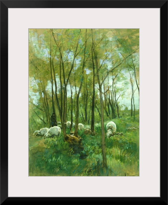 <p>Sheep in a Forest, by Anton Mauve, 1848-88, Dutch watercolor painting. Shepherd with floc of sheep grazing in a woods.</p>
