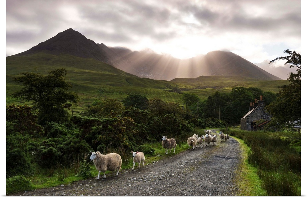 <p>Sheep walking along a road early in the morning with the rising sun behind the Black Cuillin Ridge; Glen Brittle, Skye, Scotland</p>