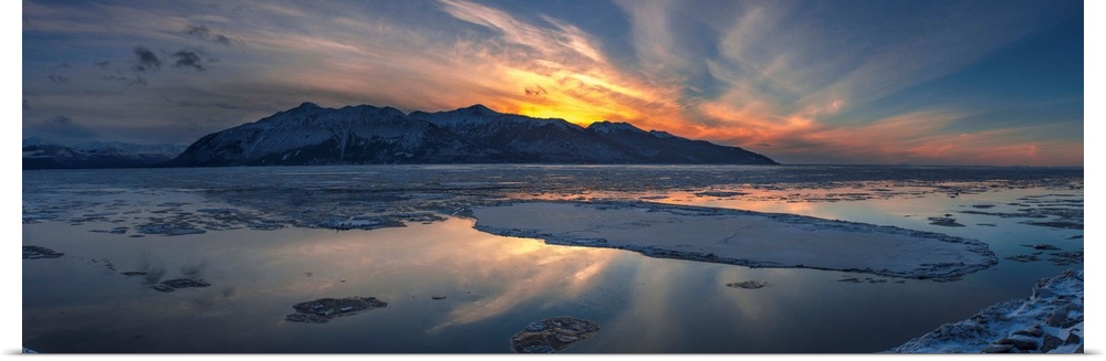 <p>Sheets of ice being carried out with outgoing tide on Turnagain Arm at sunset, south of Anchorage, Alaska.</p>
