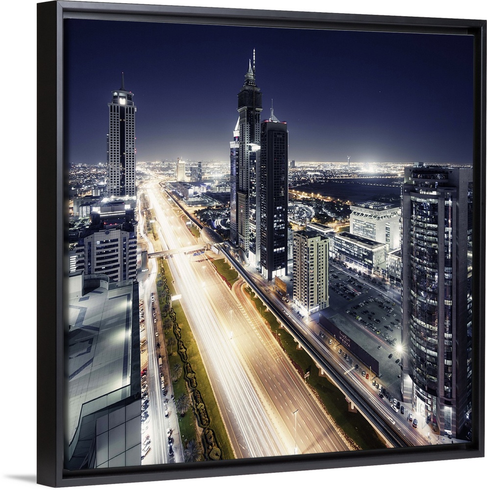 <p>Skyscraper with traffic light trails on Sheikh zayed road at night in Dubai.</p>