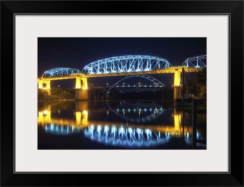 <p>Night view of Shelby Street Pedestrian Bridge and reflection of lights in water.</p>