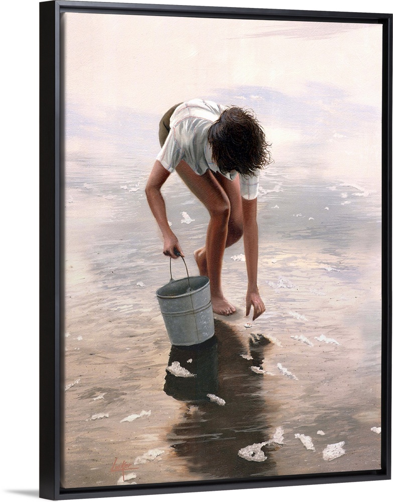 <p>Child holding bucket crouching in water to retrieve shell.</p>