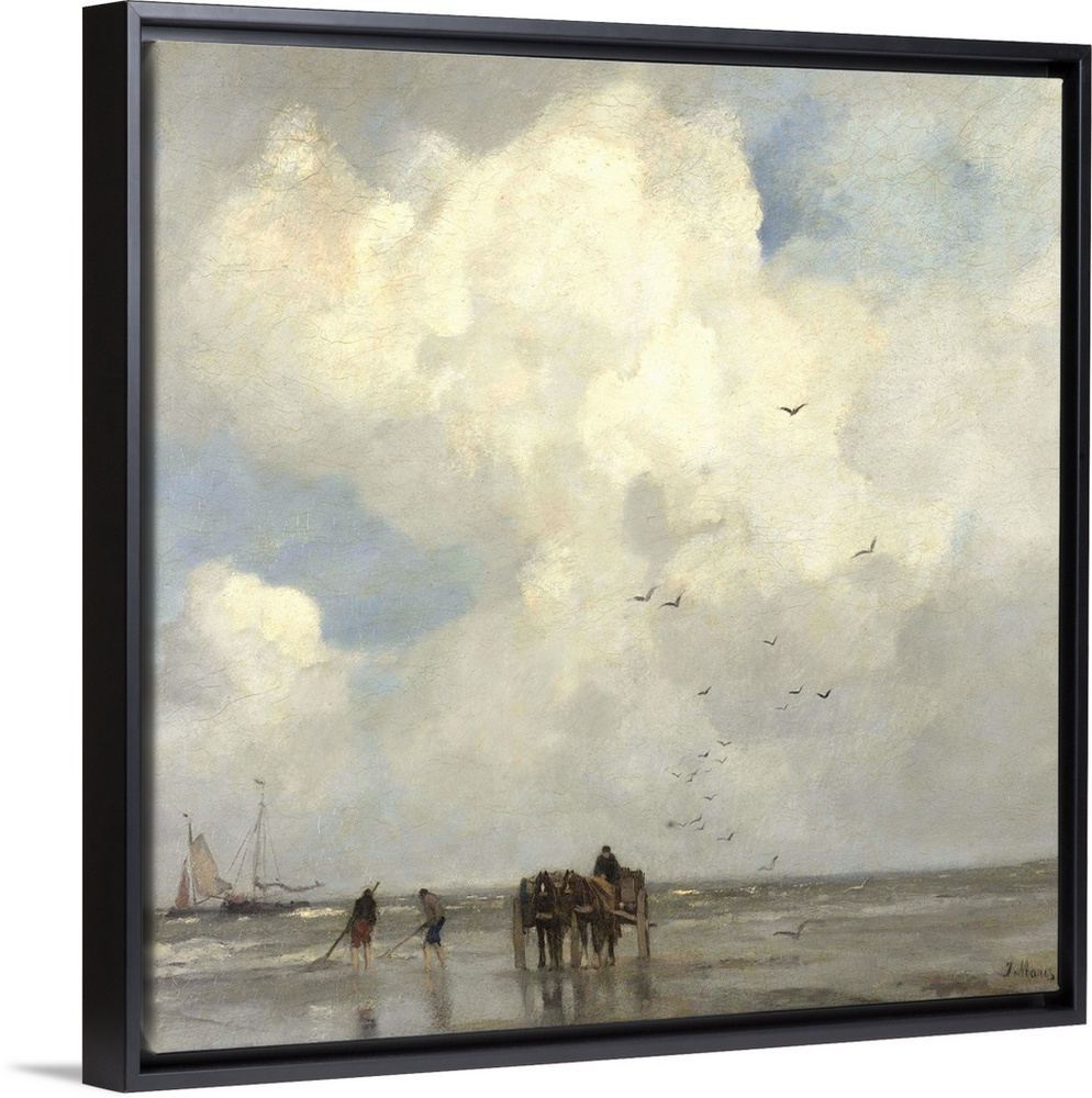 <p>Shell Fishing, by Jacob Maris, 1885, Dutch painting, oil on canvas. People on beach fishing with nets for shellfish as a two horse cart stands by.</p>