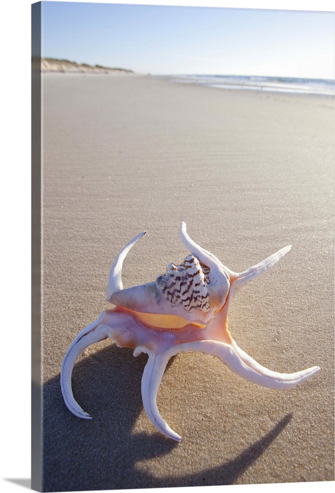 <p>Chiragra spider conch (Harpago chiragra) on a clean beach. Sea and sand in the background. Australia.</p>