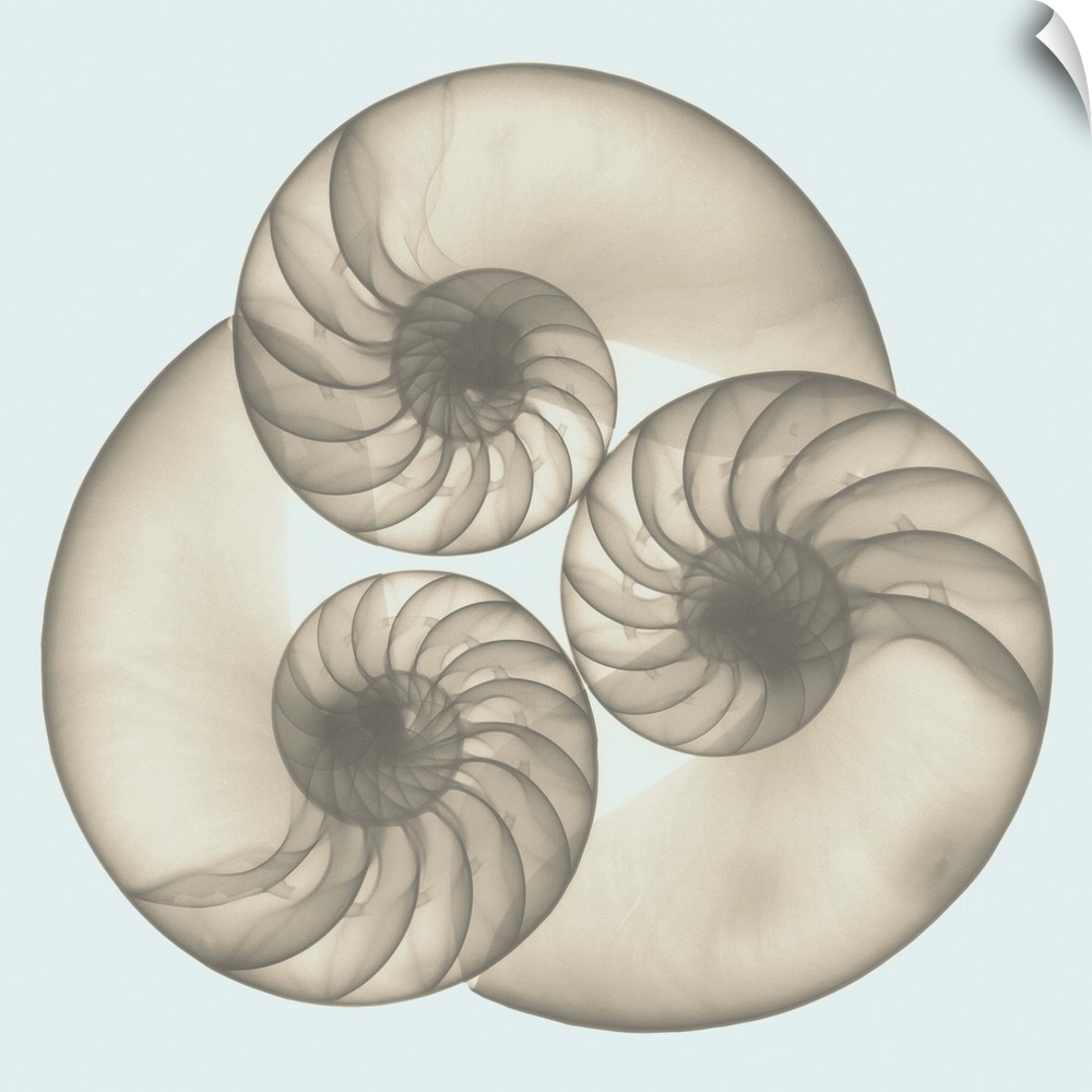 <p>Square x-ray photograph of three seashells arranged in a circular shape, against a light background.</p>
