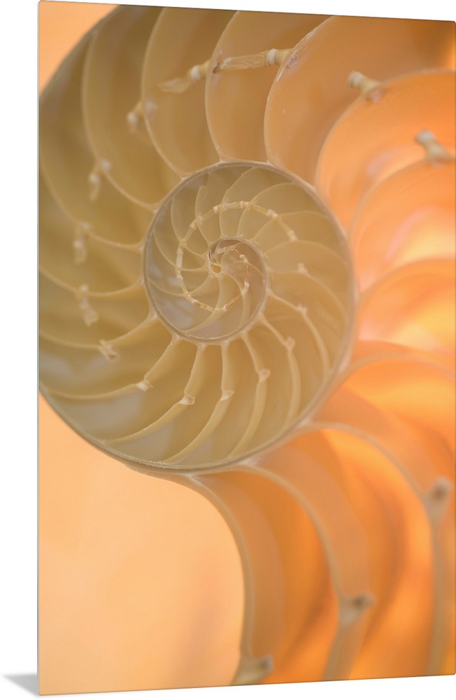 <p>A contemporary close-up of a nautilus shell rendered in glowing neutral tones.</p>