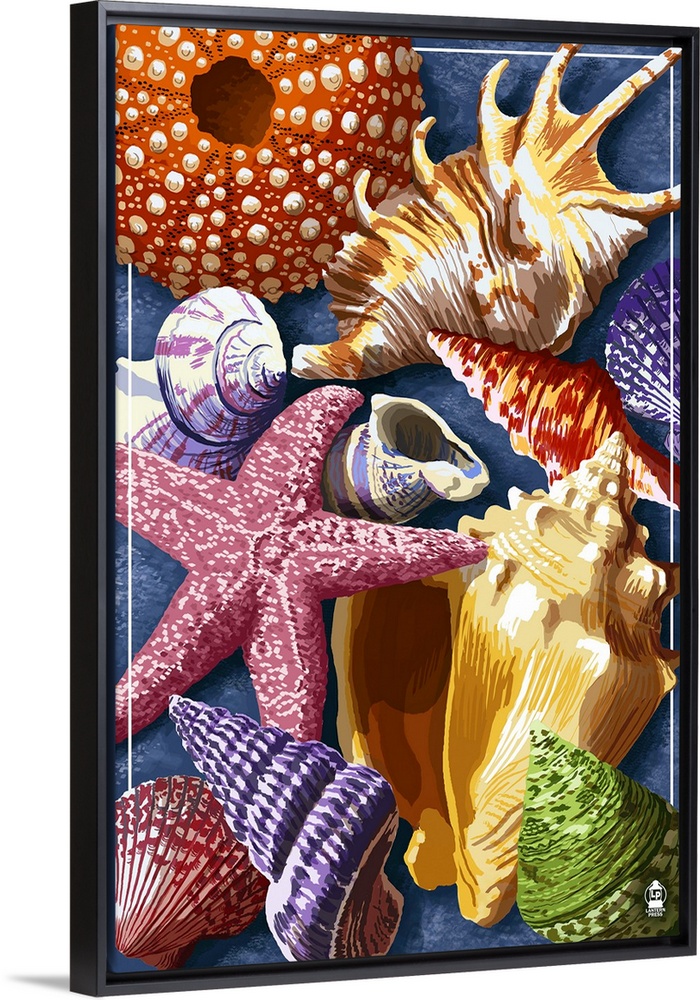 <p>Retro stylized art poster of seashells and starfish, collectively laying together.</p>