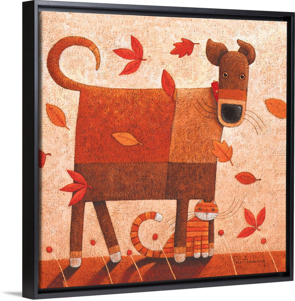 <p>Contemporary painting of a dog and cat sitting being hit with wind and autumn foliage.</p>
