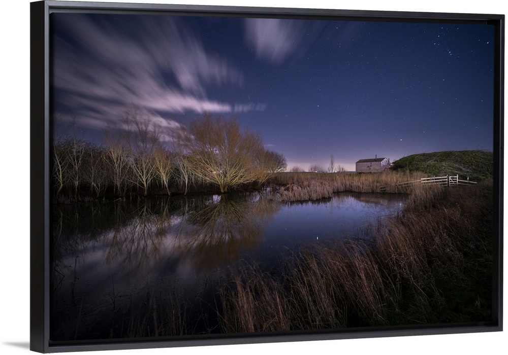 <p>Shepherd Hut and pond at night illuminated by moonlight, Elmley Nature Reserve, Kent, England, United Kingdom, Europe</p>