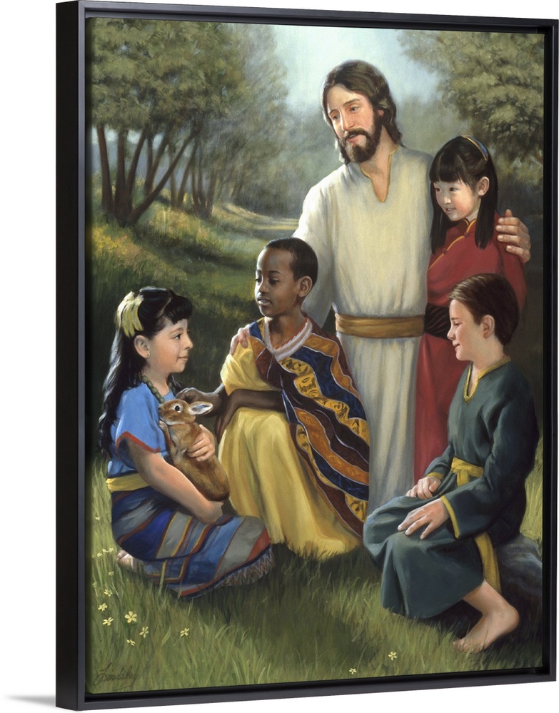 <p>Jesus with children of different ethnicities gathered around him.</p>