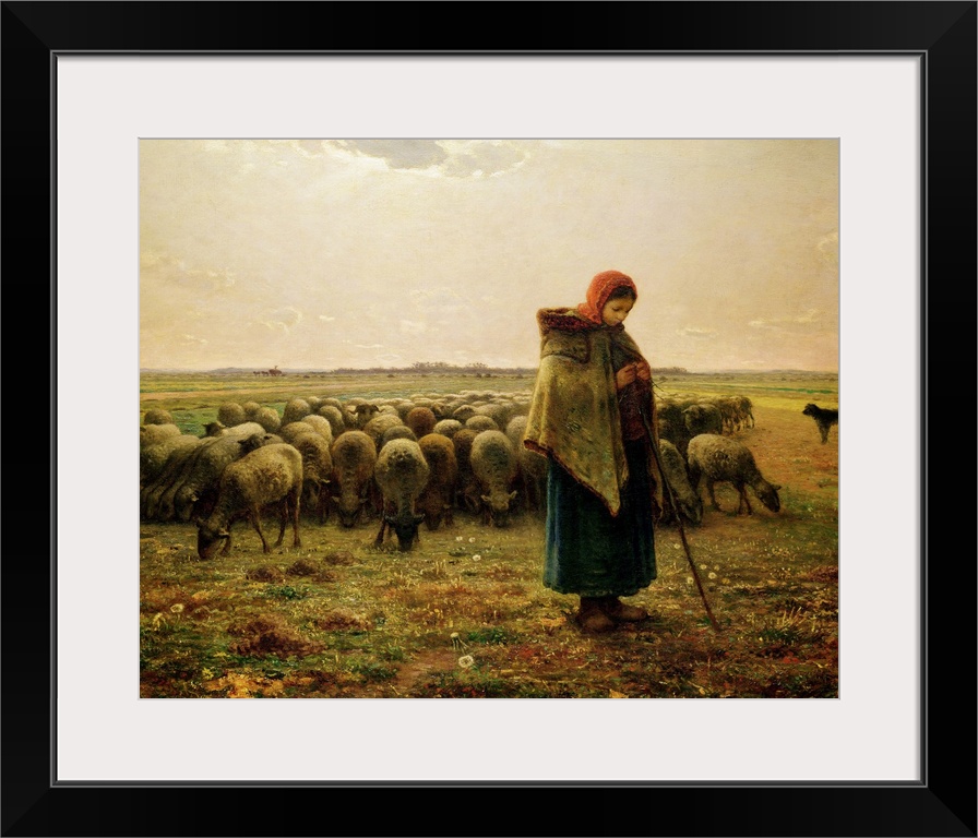 <p>Shepherdess with her Flock, 1863 (oil on canvas); by Millet, Jean-Francois (1814-75)</p>