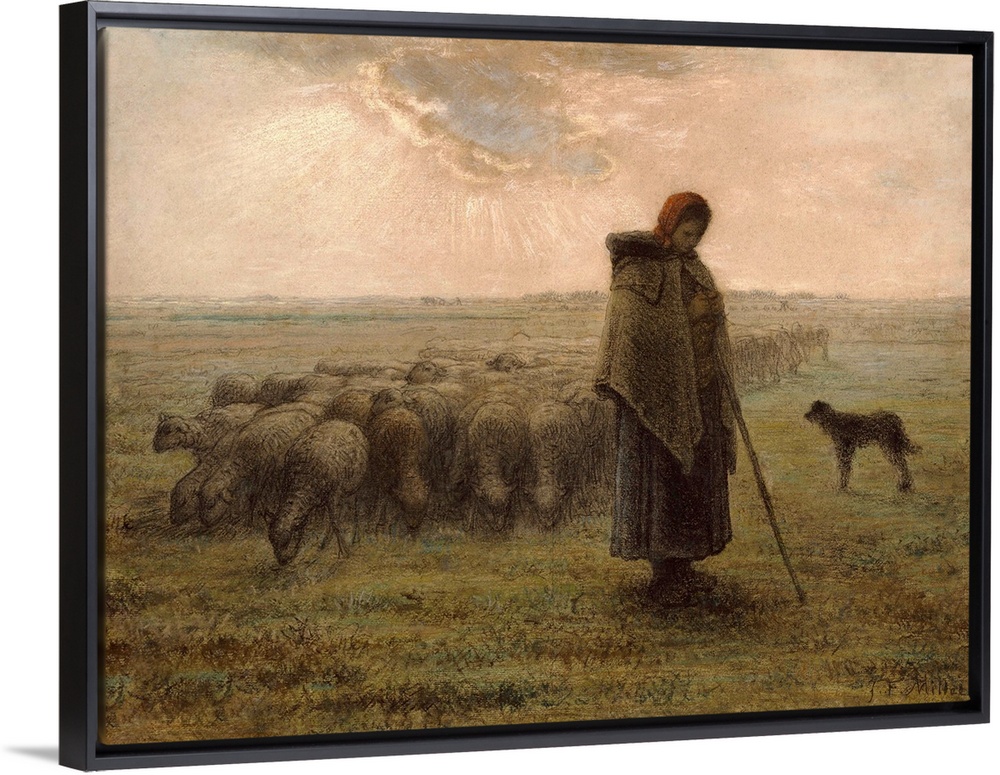<p>Shepherdess with her Flock, by Jean-Francois Millet, 1862-63, French drawing, black chalk and pastel. The shepherdess and dog are silhouetted against the sky and field in the timeless world of the peasant, which Millet sought to ennoble</p>