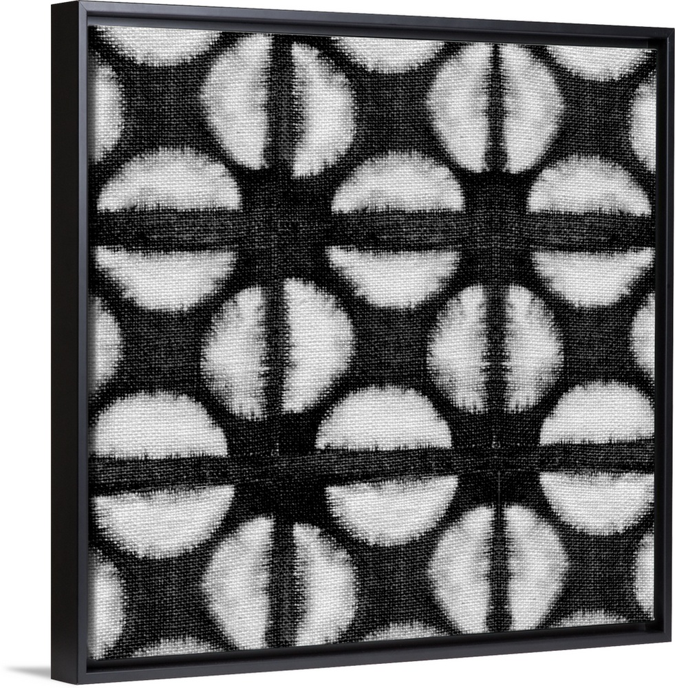 <p>Decorative design of rows of white circles with lines going through them on black linen.</p>