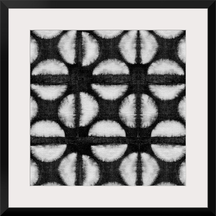 <p>Decorative design of rows of white circles with lines going through them on black linen.</p>